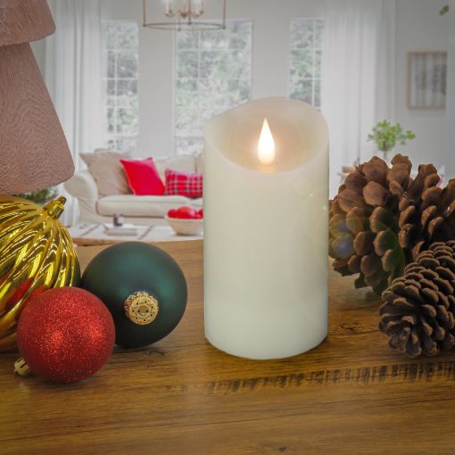 Battery operated with remote controlled functions. this flameless candle produces a realistic. soft. and safe candle glow. The smooth. ivory color exterior surface is crafted with real wax and features an uneven ‘melted’ top appearance. A handheld remote control operates the lifelike candle flame with functions that include brightness. flicker speed. and timer settings. Uses two C size batteries (not included).