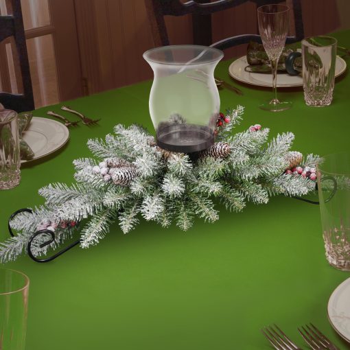 This Dunhill Fir Candleholder Centerpiece features a spray of evergreen branches with red berry and pine cone trimming. all covered in a sprinkling of soft snow. Black painted steel base is topped with a candle plate that fits a single pillar style candle. Decorative glass enclosure is included. Display this decoration in indoor locations.