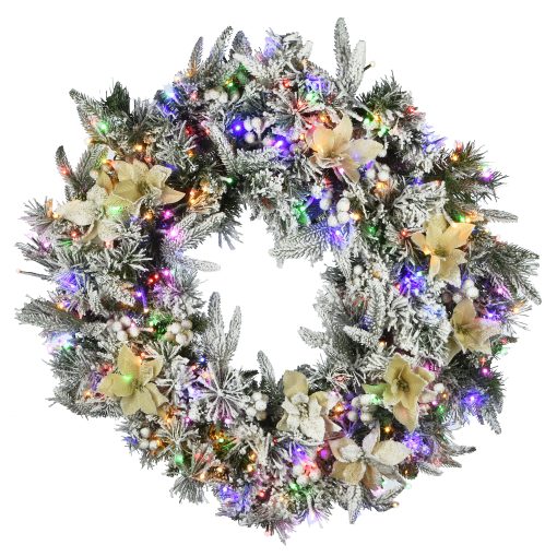 This snow-dusted Frosted Colonial Fir wreath features Feel Real branch tip technology. creating a decoration with remarkable realism. This mixed tip wreath is trimmed with golden poinsettia flowers and snow covered berry clusters. It is pre- lit with 400 Dual Color LED Cosmic Lights which are micro LED bulbs pre-lit at 4-times the volume found on wreaths of comparable size. The integrated Dual Color system features a choice of ten different warm white and multicolor light functions. This wreath can be displayed on doors. walls and windows in indoor or covered outdoor locations.