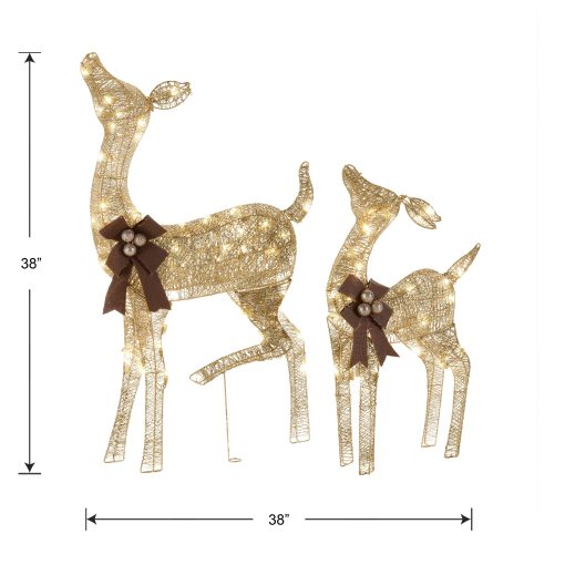 - Includes one 38 inches in height champagne gold Doe. and 28 inches in height Fawn with ribbon and ornaments. To power the lights. simply plug in to the nearest wall outlet