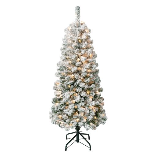 The Acacia tree offers a slim profile tree that is great for display in corners. small rooms and areas with limited space. This tree features flocked branches giving the appearance of freshly fallen snow. It ispre-lit with 100 clear lights that remain lit even if a bulb burns out. This tree features hinged branches for ease of assembly. Sturdy folding metal tree stand is included.