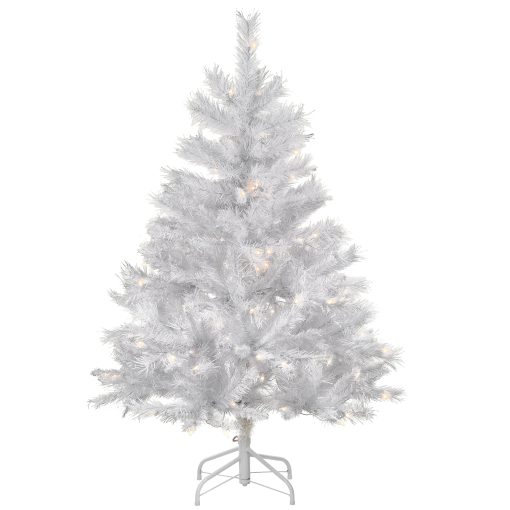 The Winchester White Pine tree is an attractive alternative to the traditional green holiday centerpiece. Its small size makes this tree a great choice for display on tabletop. in secondary rooms or children’s rooms. Pre-strung with 150 clear lights. it features hinged branch construction and includes a sturdy metal tree stand making assembly quick and easy. Though compact in size. the fullness of design provides plenty of branches for holiday trimmings.