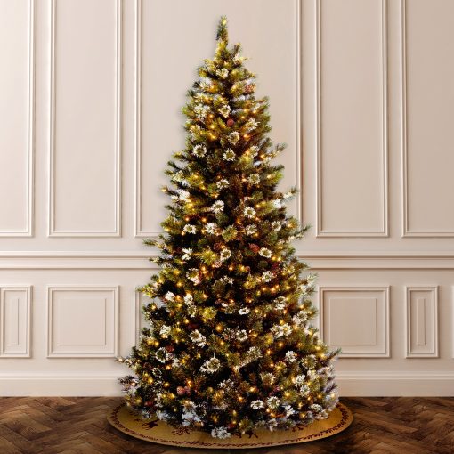 The Glittery Pine is an evergreen tree mixed with bristle branches that is trimmed with pinecones and features snow-sprinkled branch tips. It is pre-strung with 900 clear lights that remain lit even if a bulb burns out. This four section tree features hinged branches for ease of assembly. Sturdy folding metal tree stand is included.