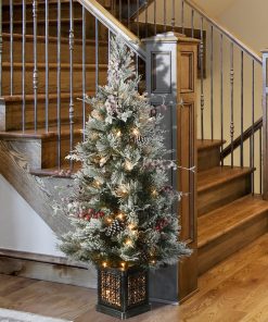 This Snowy Bedford Pine entrance tree is an attractive addition to doorway. deck. porch or patio. This mixed tip tree is trimmed with cedar leaves. pine cones and red berries. all lightly flocked as if dusted with freshly fallen snow. It is pre-lit with 100 clear lights that remain lit even if a bulb burns out. Also featured is a square ornate base that is lit from inside creating a pleasant glow. Can be displayed in any indoor or covered outdoor location.