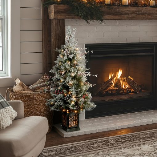 This Snowy Bedford Pine entrance tree is an attractive addition to doorway. deck. porch or patio. This mixed tip tree is trimmed with cedar leaves. pine cones and red berries. all lightly flocked as if dusted with freshly fallen snow. It is pre-lit with 100 clear lights that remain lit even if a bulb burns out. Also featured is a square ornate base that is lit from inside creating a pleasant glow. Can be displayed in any indoor or covered outdoor location.