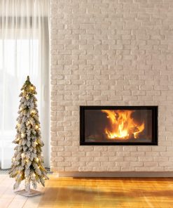 The Snowy Downswept Forestree is a slim profile tree with a downswept branch design and sturdy steel plate base. Branches. pole and base are sprinkled with flocking for the appearance of freshly fallen snow. This tree is pre-strung with 100 clear lights that remain lit even if a bulb burns out. Display this attractive evergreen in indoor or covered outdoor locations.