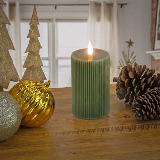 Battery operated with remote controlled functions. this flameless candle produces a realistic. soft. and safe candle glow. The exterior surface is crafted with real wax and features an elegant vertical ridged design in an attractive dark green finish. A handheld remote control operates the lifelike candle flame with functions that include brightness. flicker speed. and timer settings. Uses two C size batteries (not included).