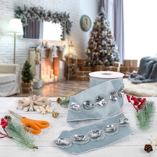 The HGTV Home Collection by National Tree Company 4 inch silver sequin beaded blue taffeta ribbon with silver piping is a beautiful choice that can add a touch of elegance and sparkle to your decor! Its elegant design can add a touch of sophistication to a variety of crafts. holiday decorations. and gift wrapping.