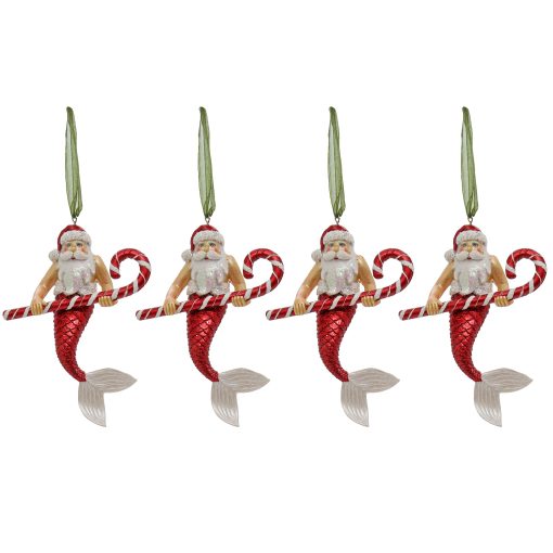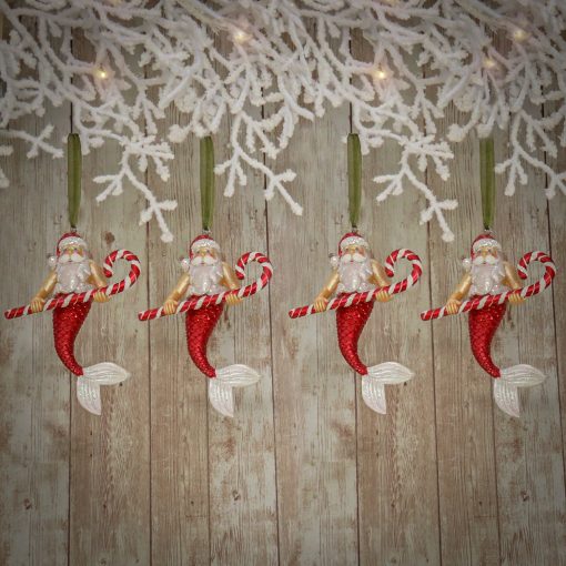 The HGTV Home Collection by National Tree Company 4 piece glass Santa merman ornaments holding candy canes sound whimsical and fun! They’ll add a playful touch to your holiday decor and are sure to be a conversation starter. You can hang them on your Christmas tree. use them in garlands. or even display them in decorative bowls or on a mantle. Their unique design makes them perfect for a beach-themed or coastal holiday display. especially if you mix them with other ocean-inspired ornaments.