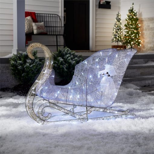 - Includes one 48 inches in length silver and gold Santa’s Sleigh with ribbon and ornaments. To power the lights. simply plug in to the nearest wall outlet
