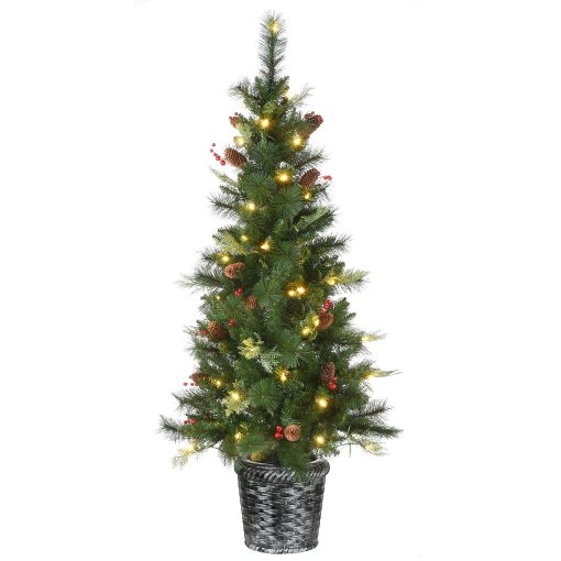 The Buzzard Pine Entrance Tree is a welcoming addition to doorway. deck. porch. or patio. This mixed tip evergreen tree is trimmed with red berries and pinecones for added appeal. It is pre-lit with 70 long-lasting warm white LED lights and seated in a decorative ply resin base with basket weave design. Display this attractive greenery in any indoor or covered outdoor location.