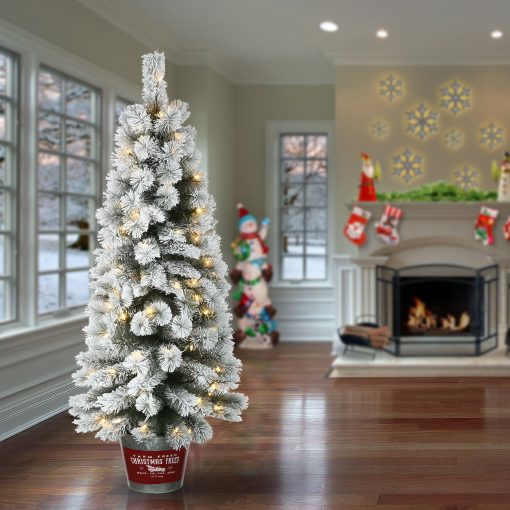 The Snowy Pogue Pine Entrance Tree is a welcoming addition to doorway. deck. porch. or patio. The mixed evergreen and bristle branch tips of this tree are dusted with the look of freshly fallen snow. It features Feel Real branch tip technology. creating a tree with remarkable realism. These crush-resistant branch tips are molded from real tree branches for an authentic living tree appearance. It is pre-lit with 100 warm white LED lights and seated in a vintage style steel pot base. Display this festive decoration in any indoor or covered outdoor location.