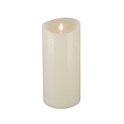 Battery operated with remote controlled functions. this flameless candle produces a realistic. soft. and safe candle glow. The smooth. ivory color exterior surface is crafted with real wax and features an uneven ‘melted’ top appearance. A handheld remote control operates the lifelike candle flame with functions that include brightness. flicker speed. and timer settings. Uses two C size batteries (not included).