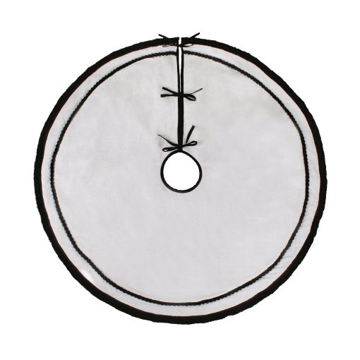 The HGTV Home Collection by National Tree Company White Tree Skirt with Black Trim is a classic and stylish choice! The clean white color provides a fresh and elegant backdrop. while the black trim adds a modern contrast. The split seam and string ties make it easy to secure around your tree. This skirt can complement a wide range of ornaments and decorations. from bright colors to metallics.