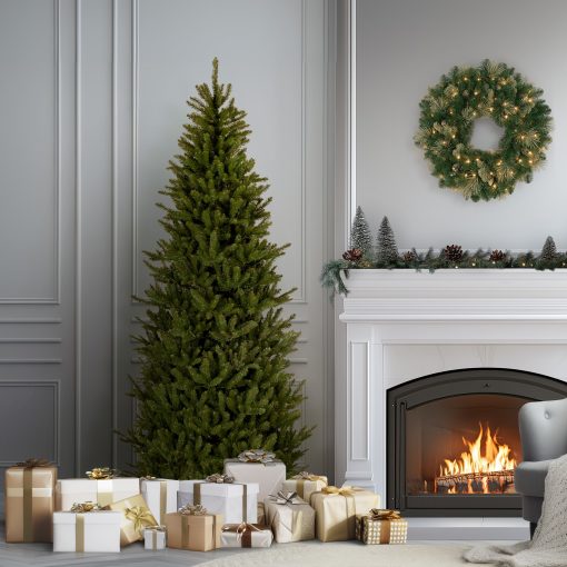 This Natural Fraser Fir tree features a slim profile that may be a better fit for corners or areas with limited space. This tree features hinged branch construction for ease of assembly. Sturdy metal tree stand is included.