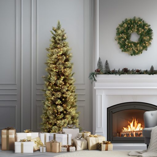 This Carolina Pine tree offers a slim profile tree that is great for display in corners. small rooms and areas with limited space. It features mixed bristle and cashmere branch tips for an overall softer appearance. It is trimmed with pinecones for added natural appeal and is pre-strung with 350 clear lights that remain lit even if a bulb burns out. This tree features hinged branch construction for ease of assembly. Sturdy folding metal tree stand is included.