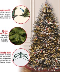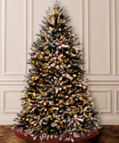 The Dunhill Fir features tightly packed branches sprinkled with snow. It is trimmed with red berries and pine cones and is pre-strung with 650 clear lights that remain lit even if a bulb burns out. The hinged branch construction of this three section tree adds to ease of assembly. Sturdy folding metal tree stand is included.