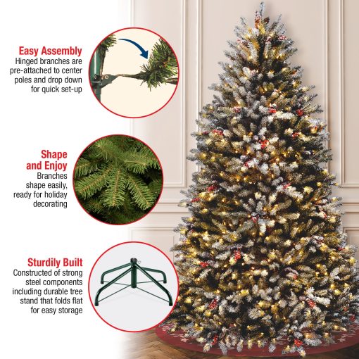 The Dunhill Fir features tightly packed branches sprinkled with snow. It is trimmed with red berries and pine cones and is pre-strung with 650 clear lights that remain lit even if a bulb burns out. The hinged branch construction of this three section tree adds to ease of assembly. Sturdy folding metal tree stand is included.