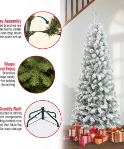 The Acacia tree offers a slim profile tree that is great for display in corners. small rooms and areas with limited space. This tree features flocked branches giving the appearance of freshly fallen snow. This tree features hinged branches for ease of assembly. Sturdy folding metal tree stand is included.