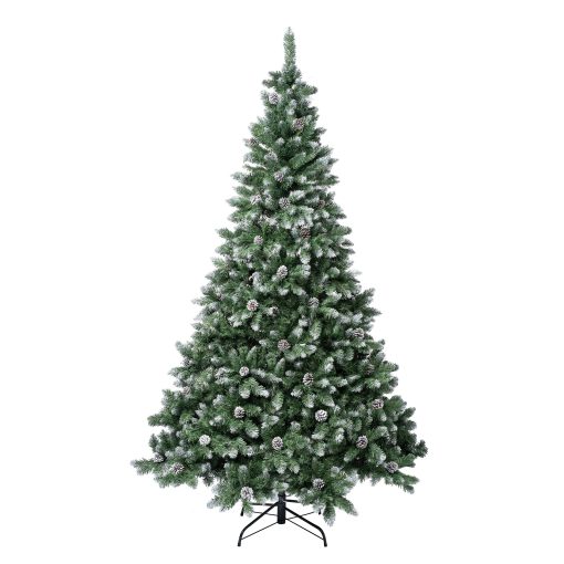 The Oakley Hills Snow tree is a full-bodied tree that features white-tipped branches giving the appearance of freshly fallen snow. It is trimmed with pinecones for added natural appeal. Designed with hinged branches for easy assembly and includes a sturdy metal folding stand. For indoor display only.