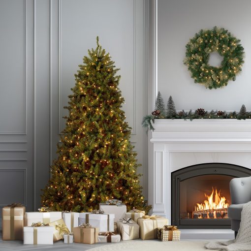 The Dunhill Fir is a full body tree featuring a generous number of branch tips for holding holiday trimmings. It is pre-strung with 600 clear lights that remain lit even if a bulb burns out. This tree features hinged branch construction for ease of assembly. Sturdy folding metal tree stand is included.