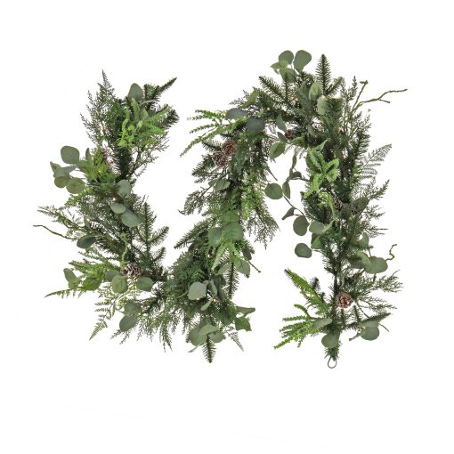 The HGTV Home Collection by National Tree Company Winter Garden Eucalyptus Tip Garland features mixed branch tips flowing from a flexible vine base. Its versatile design can complement a variety of holiday themes. It is pre-lit with 50 battery operated LED lights that are energy-efficient and long lasting. Included is an option for 6 hours ON/18 hours OFF timed operation. Create a timeless look with hanging this garland on any entryway. fireplace mantel. or stairway.For indoor or covered outdoor display.