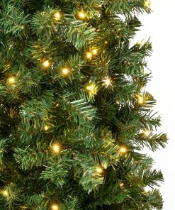The Linden Spruce Slim tree offers an extra thin profile making it a great choice for display in corners or in areas where floor space is limited. It features wrapped branch construction for ease of assembly. It is pre-lit with 250 warm white LED lights that are long lasting and energy efficient. Crafted with high quality materials and hinged branches for easy set up and includes a sturdy metal folding stand. For indoor display only.
