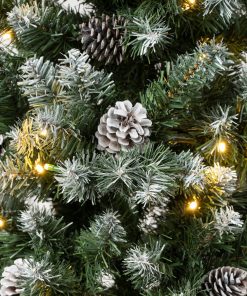 The Oakley Hills Snow Slim tree features white-tipped branches giving the appearance of freshly fallen snow. It is trimmed with pinecones for added natural appeal. The slim profile makes it a great choice for display in corners or in areas where floor space is limited. This tree is pre-lit with 250 warm white LED lights that are energy-efficient and long lasting. Designed with hinged branches for easy assembly and includes a sturdy metal folding stand. For indoor display only.