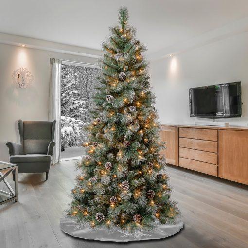 The Perry Hard Needle tree features a mix of snow-dusted evergreen and bristle branch tips. Trimmed with snow dusted pine cones. it is pre-lit with 200 clear lights that remain lit even if a bulb burns out. Crafted with high quality materials and hinged branches for easy set up and includes a sturdy metal folding stand. For indoor display only.