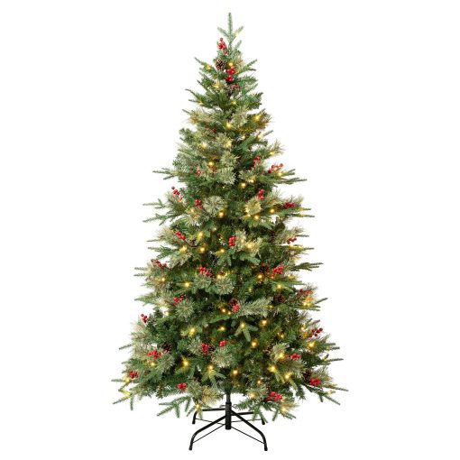 The Virginia Pine tree features Feel Real branch tip technology. creating a tree with remarkable realism. These crush-resistant branch tips are molded from real tree branches for an authentic living tree appearance. Branches are a mixture of evergreen and bristle tips that are trimmed with red berries and pinecones. It is pre-lit with 200 warm white LED lights that are long lasting and energy efficient. Crafted with high quality materials and hinged branches for easy set up and includes a sturdy metal folding stand. For indoor display only.