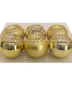 This set consists of six gold color ball ornaments that feature a recessed design with ornate gold sparkled trimmings. Included are ornaments in both gloss and matte finishes. all constructed of lightweight and shatterproof polystyrene material. This set is a fantastic choice for adding a touch of luxury and warmth to your holiday decor! With the shimmering gold finish. they can catch the light beautifully and elevate the look of your tree or wreath.