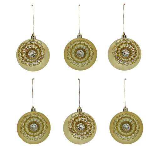 This set consists of six gold color ball ornaments that feature a recessed design with ornate gold sparkled trimmings. Included are ornaments in both gloss and matte finishes. all constructed of lightweight and shatterproof polystyrene material. This set is a fantastic choice for adding a touch of luxury and warmth to your holiday decor! With the shimmering gold finish. they can catch the light beautifully and elevate the look of your tree or wreath.