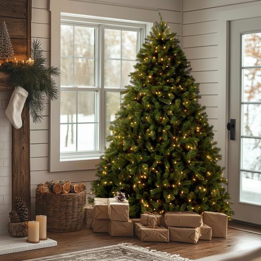 - This Downswept Douglas Fir Full Pre-Lit Artificial Green Christmas Tree is 7.5 feet tall with a 68 inch base diameter. Featuring hundreds of Feel Real individually crafted branch tips to create full bodied branches. this tree is designed to look and feel lifelike.