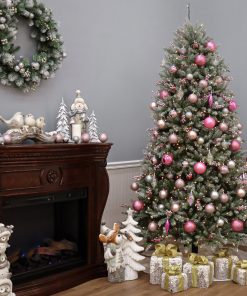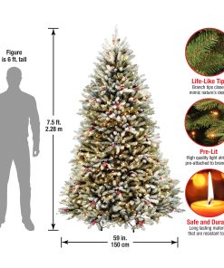 - This Dunhill FirPre-Lit Green Christmas Tree is 7.5 feet tall with a 59 inch base diameter. Flocked with pine cones. berries and frosted branches for added decoration and featuring tens of individually crafted branch tips to create full bodied branches.