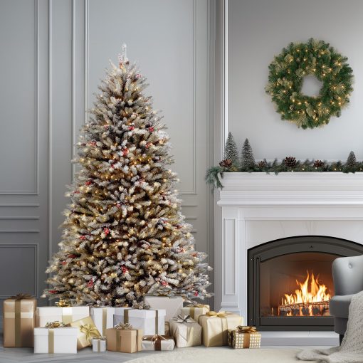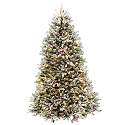 The Dunhill Fir tree features snow sprinkled branch tips and is trimmed with clusters of red berries and pinecones. It is pre-strung with 750 clear lights that remain lit even if a bulb burns out. This tree features hinged branch construction for ease of assembly. Sturdy metal tree stand is included.