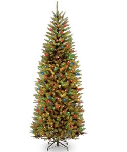 This Kingswood Fir slim tree features the PowerConnect through-the-pole lighting system that eliminates the need for connecting multiple light strings. It is pre-strung with 450 Dual Colorlights that change from warm white to multicolor with the touch of a button. Included is a foot pedal switch to control 10 different light functions. The slim profile of this tree makes it a great choice for areas with limited floor space. This tree features hinged branch construction for ease of assembly. Sturdy metal tree stand is included.
