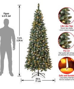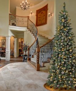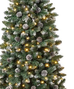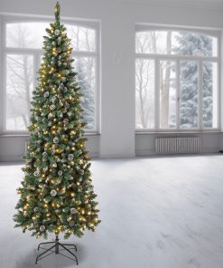 This Oakley Hill Snow tree features flocked branches and pinecones giving the appearance of freshly fallen snow. It is pre-strung with 350 warm white LED lights that remain lit even if a bulb burns out. The slim profile of this tree may be a better fit for corners or areas with limited floor space. This tree features hinged branches for ease of assembly. Sturdy folding metal tree stand is included.