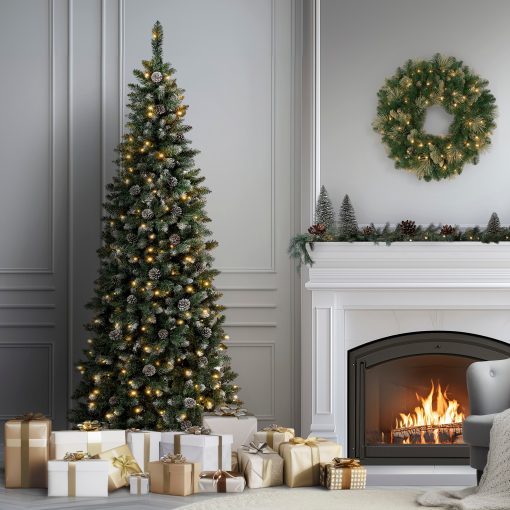 This Oakley Hill Snow tree features flocked branches and pinecones giving the appearance of freshly fallen snow. It is pre-strung with 350 warm white LED lights that remain lit even if a bulb burns out. The slim profile of this tree may be a better fit for corners or areas with limited floor space. This tree features hinged branches for ease of assembly. Sturdy folding metal tree stand is included.