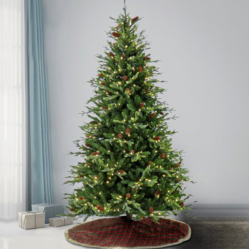The Skykomish Pine tree is a full body tree featuring a generous number of branch tips for holding holiday trimmings. This tree is trimmed with pinecones for added natural appeal and is pre-lit with 550 warm white LED lights that are long lasting and energy efficient. This three-section tree is designed with hinged branches for ease of assembly. Sturdy folding metal tree stand is included.