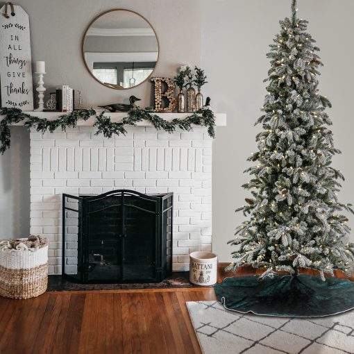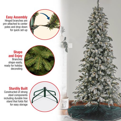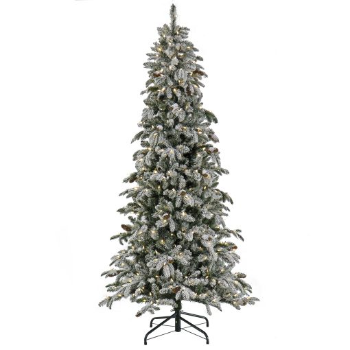 The Snowy Vintin Fir tree features Feel Real branch tip technology. creating a tree with remarkable realism. These crush-resistant branch tips are molded from real tree branches for an authentic living tree appearance. This tree is trimmed with pinecones and dusted with the look of freshly fallen snow. It is pre-lit with 400 warm white LED lights that are long lasting and energy efficient. This three-section tree is designed with hinged branches for ease of assembly. Sturdy folding metal tree stand is included. For indoor display.