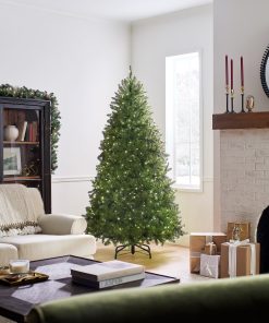 This Dunhill Fir tree features the PowerConnect through-the-pole lighting system that eliminates the need for connecting multiple light strings. It is pre-strung with 650 Dual Colorlights that change from warm white to multicolor with the touch of a button. Included is a foot pedal switch to control 10 different light colors and actions. This tree features hinged branch construction for ease of assembly. Sturdy metal tree stand is included.