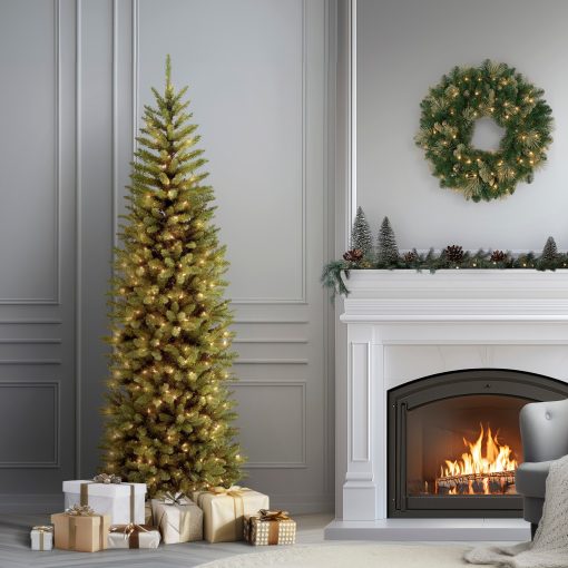 - This Kingswood Fir Slim Pre-Lit Artificial Green Christmas Tree is 7 feet tall with a 29 inch base diameter. Featuring hundreds of individually crafted branch tips to create full bodied branches. this tree is designed to look and feel lifelike.