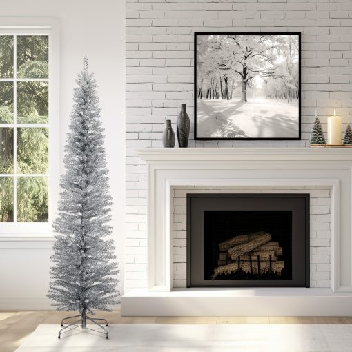 - This Tinsel Artificial Silver Christmas Tree is 7 feet tall with a 24 inch base diameter. Featuring hundreds of individually crafted branch tips to create full bodied branches. this tree is designed to look and feel lifelike.