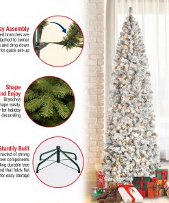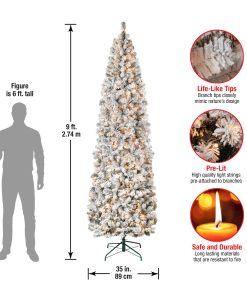 The Acacia tree offers a slim profile that makes it a great choice for display in corners or in areas where floor space is limited. This tree features flocked branches giving the appearance of freshly fallen snow. It is pre-lit with 500 clear lights that remain lit even if a bulb burns out. This tree features hinged branches for ease of assembly. Sturdy folding metal tree stand is included.