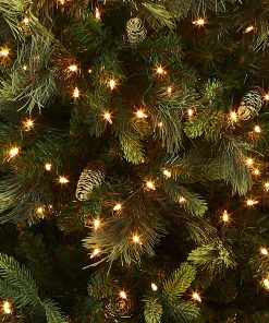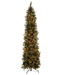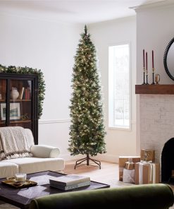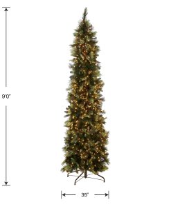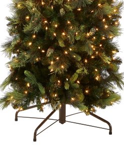 This Carolina Pine tree offers a slim profile tree that is great for display in corners. small rooms and areas with limited space. It features mixed bristle and cashmere branch tips for an overall softer appearance. It is trimmed with pinecones for added natural appeal and is pre-strung with 800 clear lights that remain lit even if a bulb burns out. This tree features hinged branch construction for ease of assembly. Sturdy folding metal tree stand is included.