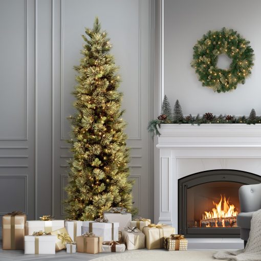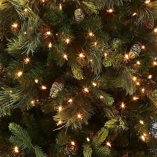 This Carolina Pine tree offers a slim profile tree that is great for display in corners. small rooms and areas with limited space. It features mixed bristle and cashmere branch tips for an overall softer appearance. It is trimmed with pinecones for added natural appeal and is pre-strung with 800 clear lights that remain lit even if a bulb burns out. This tree features hinged branch construction for ease of assembly. Sturdy folding metal tree stand is included.