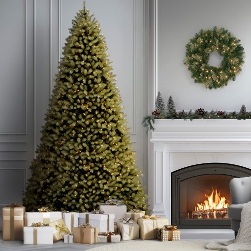 - This Downswept Douglas Fir Full Pre-Lit Artificial Green Christmas Tree is 9 feet tall with a 71 inch base diameter. Featuring hundreds of Feel Real individually crafted branch tips to create full bodied branches. this tree is designed to look and feel