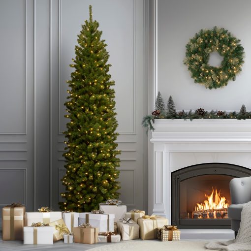 The North Valley Spruce Pencil Slim tree offers a slim profile tree that is great for display in corners. small rooms and areas with limited space. It is pre-strung with 550 clear lights that remain lit even if a bulb burns out. This tree features hinged branches for ease of assembly. Sturdy folding metal tree stand is included.