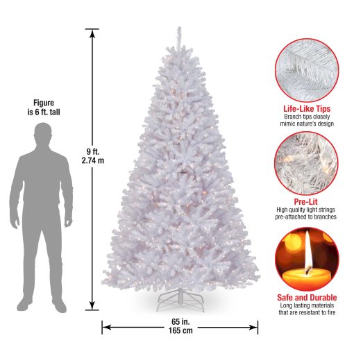 - This North Valley Spruce Full Pre-Lit Artificial White Christmas Tree is 9 feet tall with a 65 inch base diameter. Featuring hundreds of individually crafted branch tips to create full bodied branches. this tree is designed to look and feel lifelike.