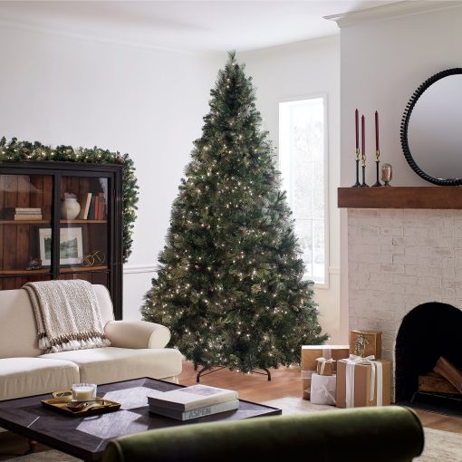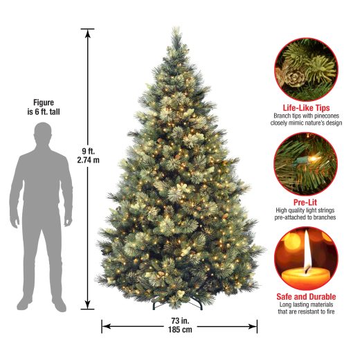 This Carolina Pine tree is a full body tree featuring mixed bristle and cashmere branch tips and is trimmed with pinecones. It is pre-strung with 900 clear lights that remain lit even if a bulb burns out. This tree features hinged branches for ease of assembly. Sturdy folding metal tree stand is included.